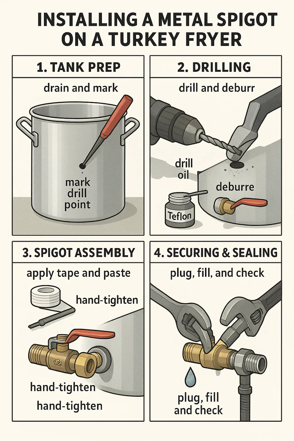 Aqui está um guia passo a passo para instalar um Spigot de metal Em uma fritadeira de peru: