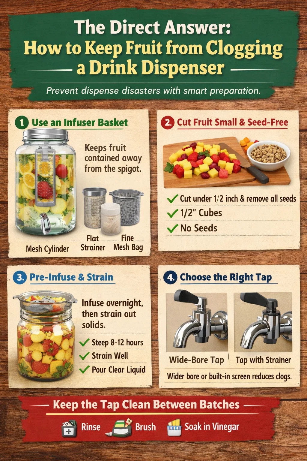 Uma das abordagens mais práticas para festas, eventos de catering ou uso diário é infundir previamente o sabor da fruta no líquido e, em seguida, coar os sólidos antes de despejá-lo no dispensador. Este método oferece sabor máximo com risco zero de entupimento.