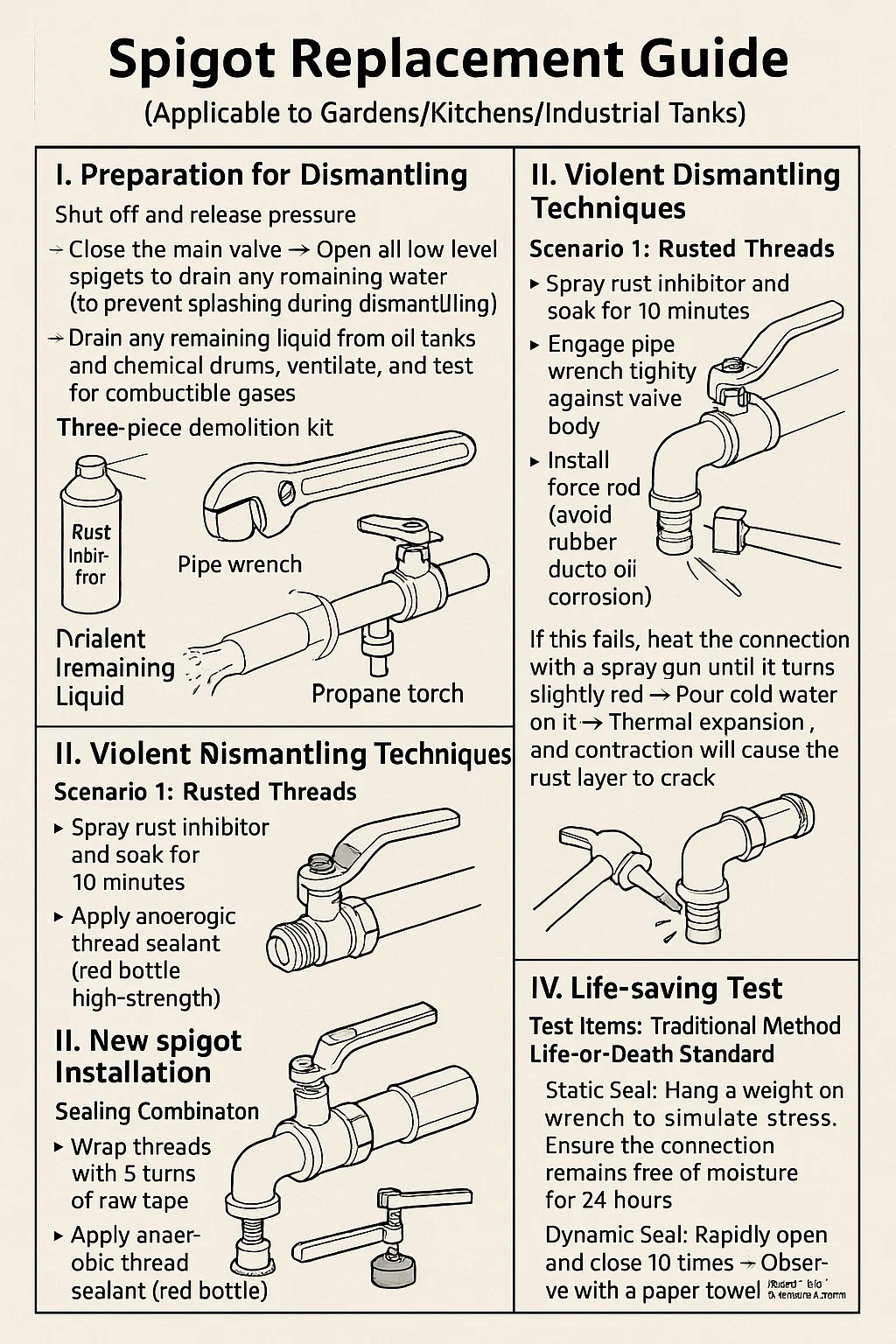 Inibidor da ferrugem por pulverização e mergulhe por 10 minutos → Envolva a chave do tubo firmemente contra o corpo da válvula → Instale a haste de força e aperte lentamente (a força repentina pode quebrar a extremidade do tubo)