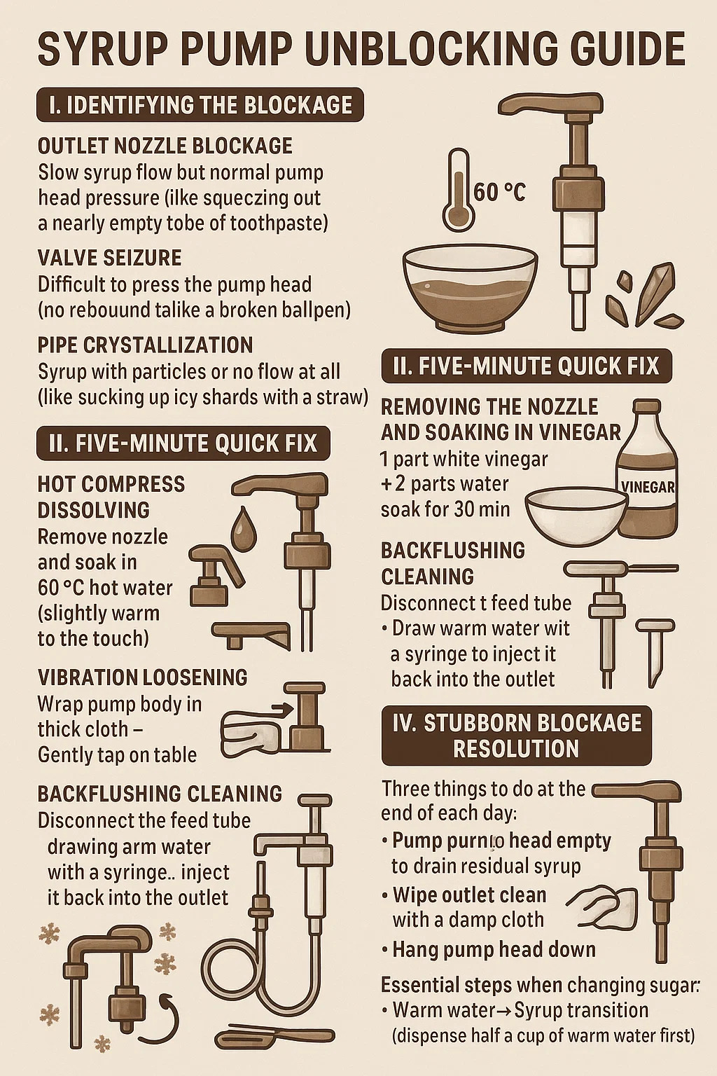 Bloqueio do bocal de saída: Fluxo lento de xarope, mas pressão normal da cabeça da bomba (como espremer um tubo de pasta de dente quase vazio)