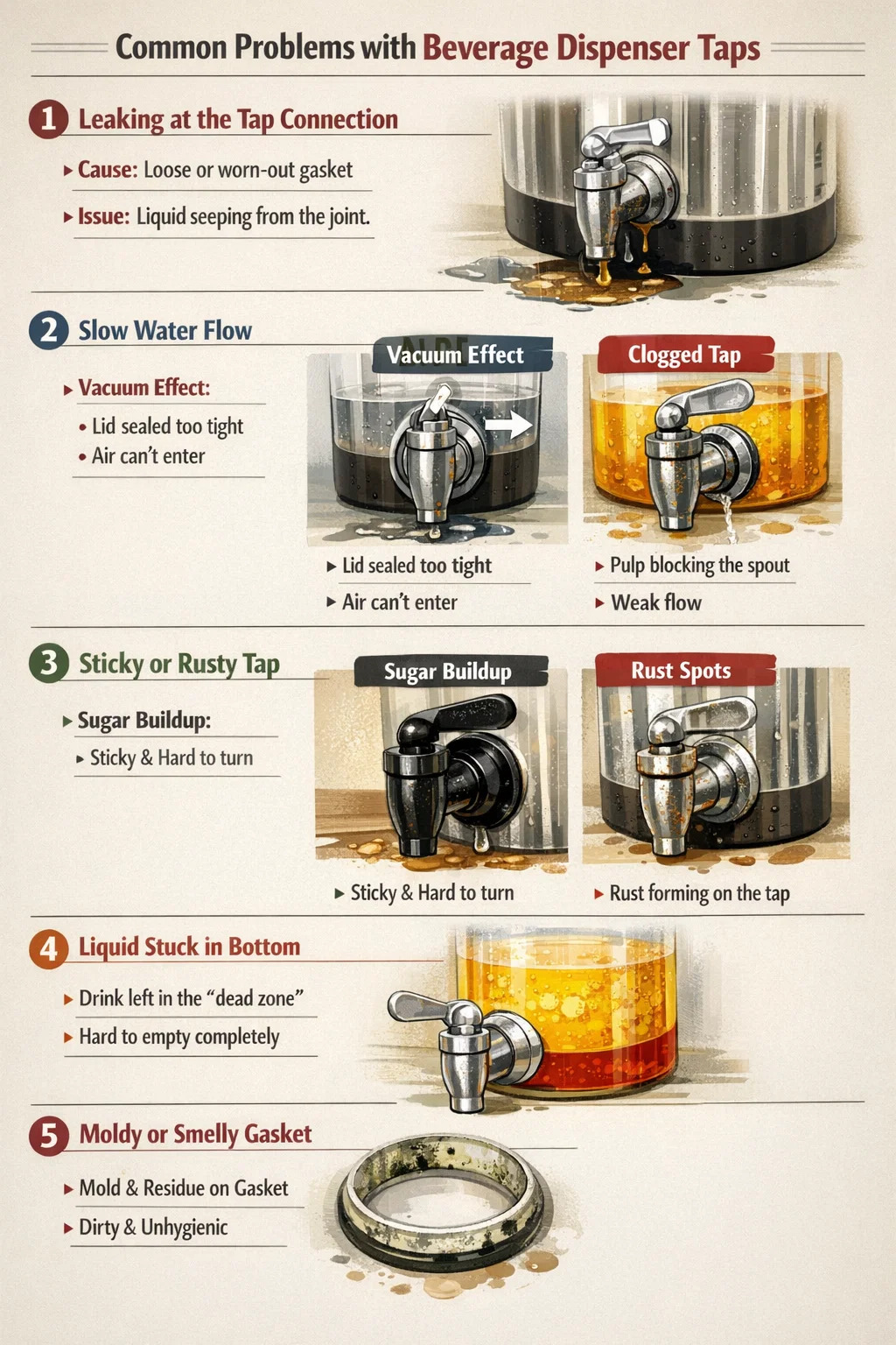 Ao usar dispensadores de bebidas, embora pareçam simples no design, você pode encontrar alguns pequenos problemas frustrantes. Isto é especialmente verdadeiro para o componente principal – o Torneira dispensadora de bebidas de metal – que está mais sujeito a problemas se não for mantido adequadamente.