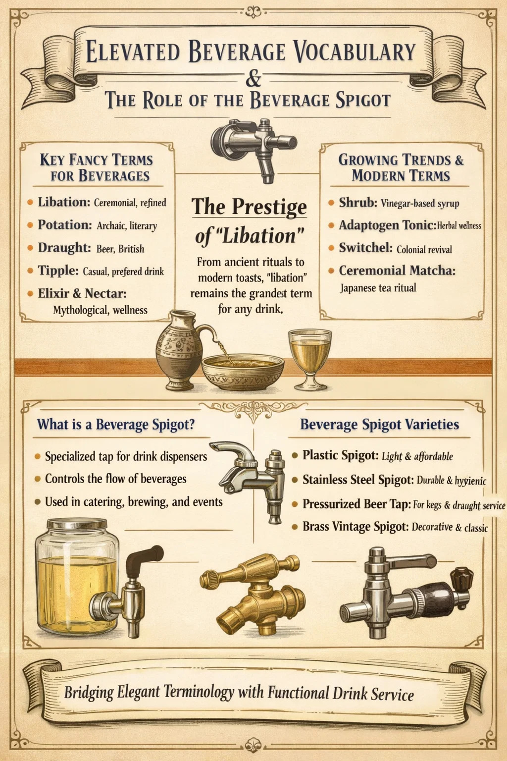 Cada um desses exemplos mostra como as bebidas funcionais adquirem nomes sofisticados por meio de empréstimos culturais, renascimento histórico ou branding deliberado. O impulso humano subjacente – elevar o que bebemos com uma linguagem que sinaliza cuidado, tradição ou sofisticação – permanece constante mesmo quando as palavras específicas mudam. E no final de cada evolução, há sempre um torneira de bebida em algum lugar, servindo a bebida do recipiente para o copo, preenchendo a lacuna entre a libação elaborada e o bebedor satisfeito.