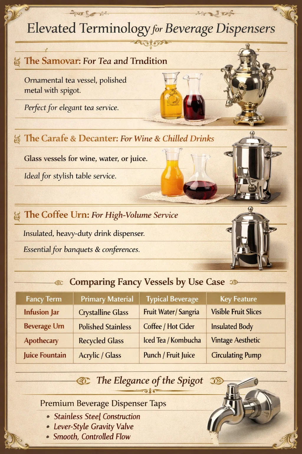 Um língua inglesa oferece uma variedade de palavras especializadas que carregam mais prestígio do que “dispenser”. Escolher a palavra certa ajuda a definir o tom do seu evento ou descrição do produto.